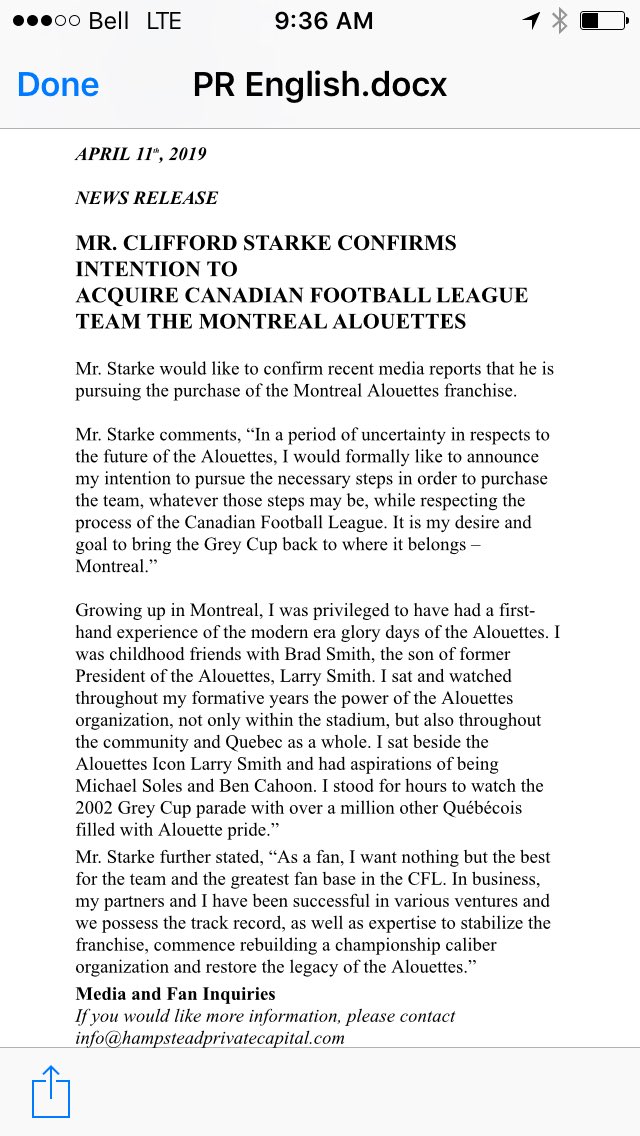 Il semble que la CFL contrôle/possède/dirige déjà les allouettes, probablement pour les revendre à un prix plus acceptable que la valeur présente (ca serait plus logique de vendre après la saison). La CFL comme proprio ne va pas faire de changements majeurs, surtout pas à un mois du début du camp.